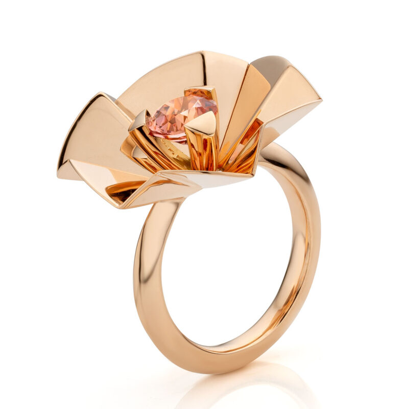 1. Waterlelies uitgebeeld in 18 karaat geelgoud met groene en roze toermalijn