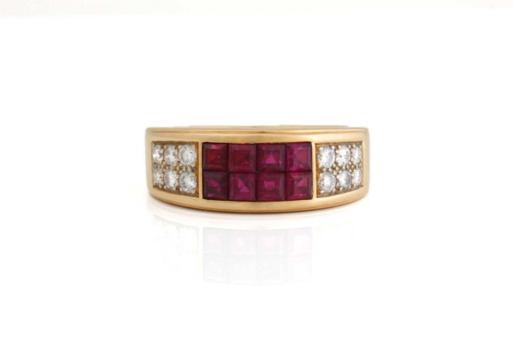 Ring met centraal 8 carre geslepen robijnen die onzichtbaar gezet zijn (serti invisible).